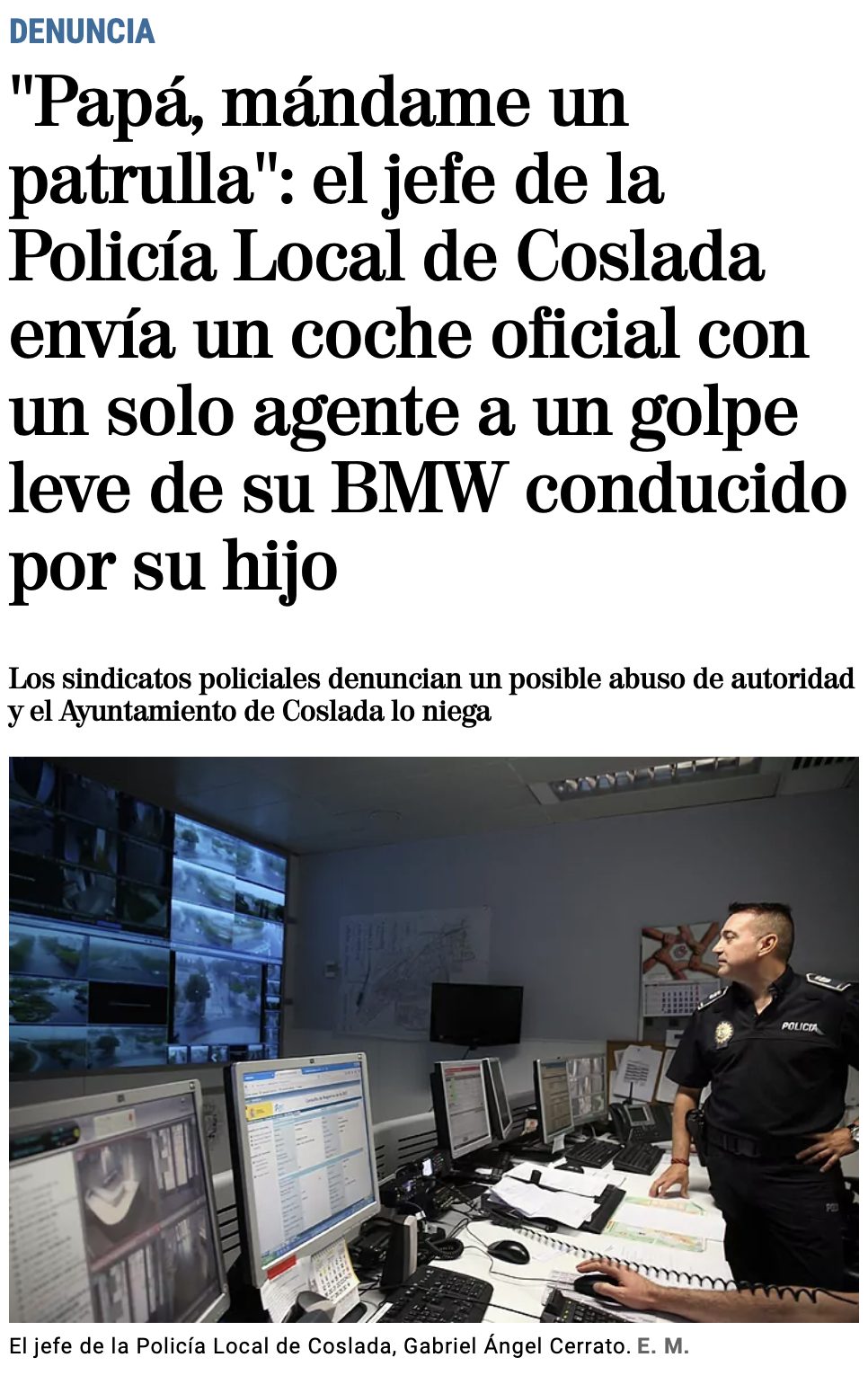 Los sindicatos de la Policía Municipal han denunciado un posible caso de abuso de autoridad por parte del Jefe de la Policía Local de Coslada, Gabriel Ángel Cerrato, tras un golpe leve sufrido por su hijo cuando este conducía su coche, un BMW, por la localidad y tuvo un roce con una furgoneta. El mando de Coslada envió al lugar un coche de la Policía Municipal con un solo agente, un cabo, tras telefonearle su hijo diciendo: «Papá, mándame un patrulla». «Que alguien pueda tener un simple roce de chapa con su coche o furgoneta mientras conduce por la ciudad podría estar dentro de la normalidad, pero lo que no es tan normal es utilizar efectivos humanos y medios desproporcionados ante un golpe leve que se soluciona con un simple parte amistoso de accidente«, señalan desde CPPM y CCOO.