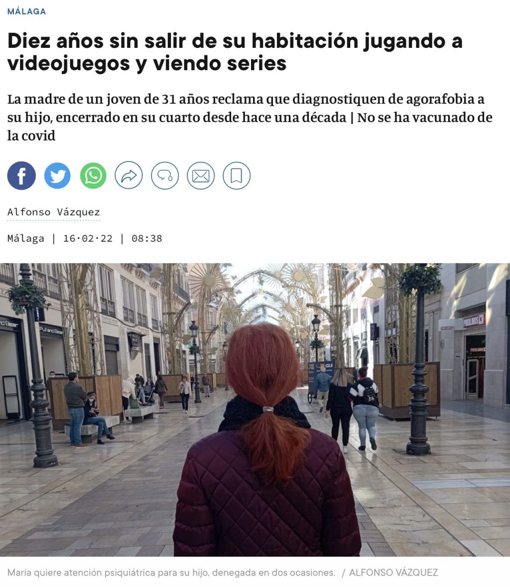 Su madre, de nombre ficticio María, calcula que su hijo, de nombre ficticio Antonio, lleva cerca de diez años sin salir de su habitación en un barrio de Málaga.