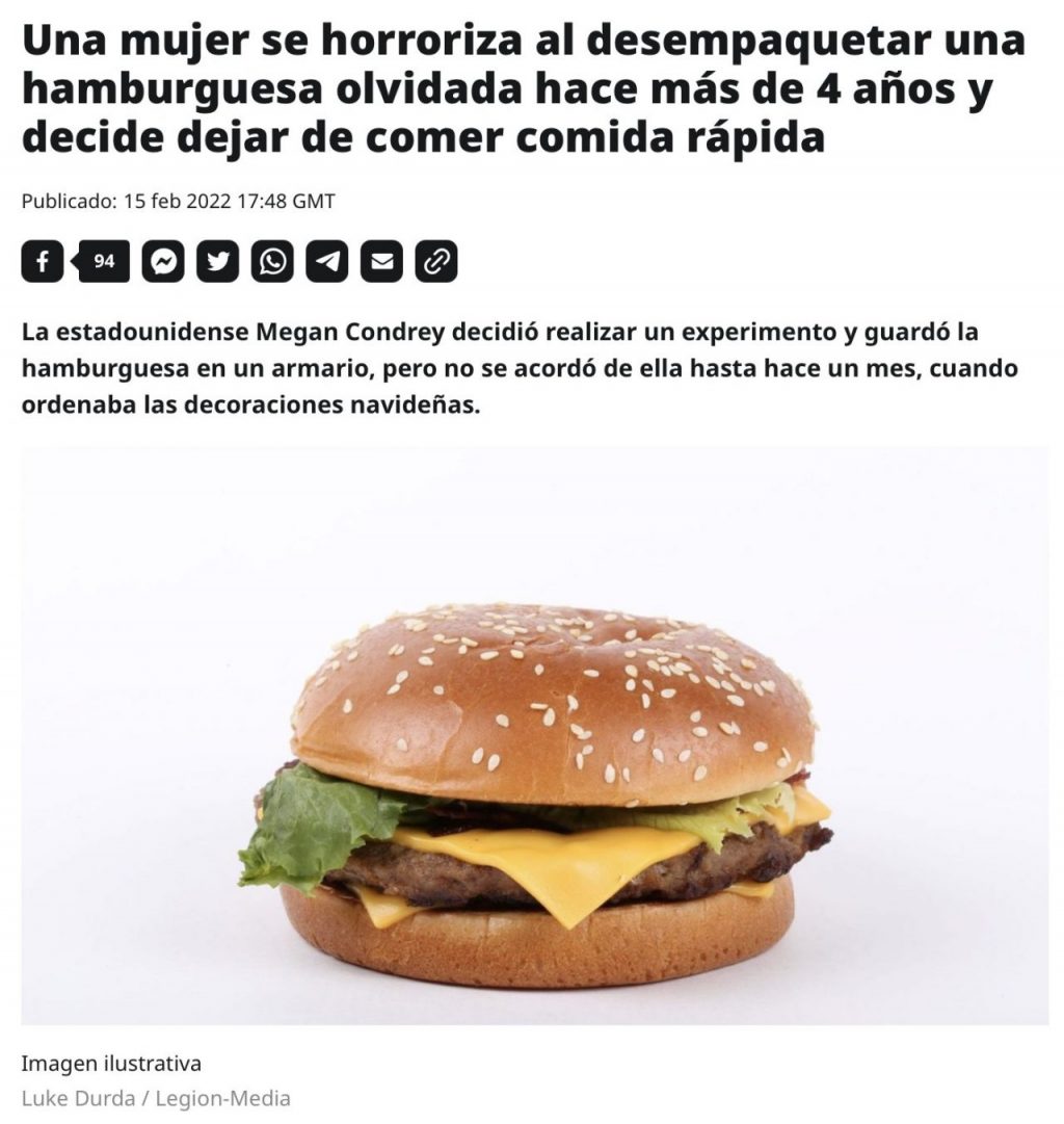 Megan Condrey, una mujer de Washington D.C., compró dos hamburguesas con queso y papas fritas en un McDonald’s en noviembre de 2017 y tras comerse una, dejó la otra en la parte trasera de su auto para más tarde, pero se olvidó de ella. Varios días después, la encontró y observó que no presentaba ningún rastro de pudrición, por lo que decidió realizar un experimento para ver cuánto tiempo podía durar, informa The Mirror. | @actualidad