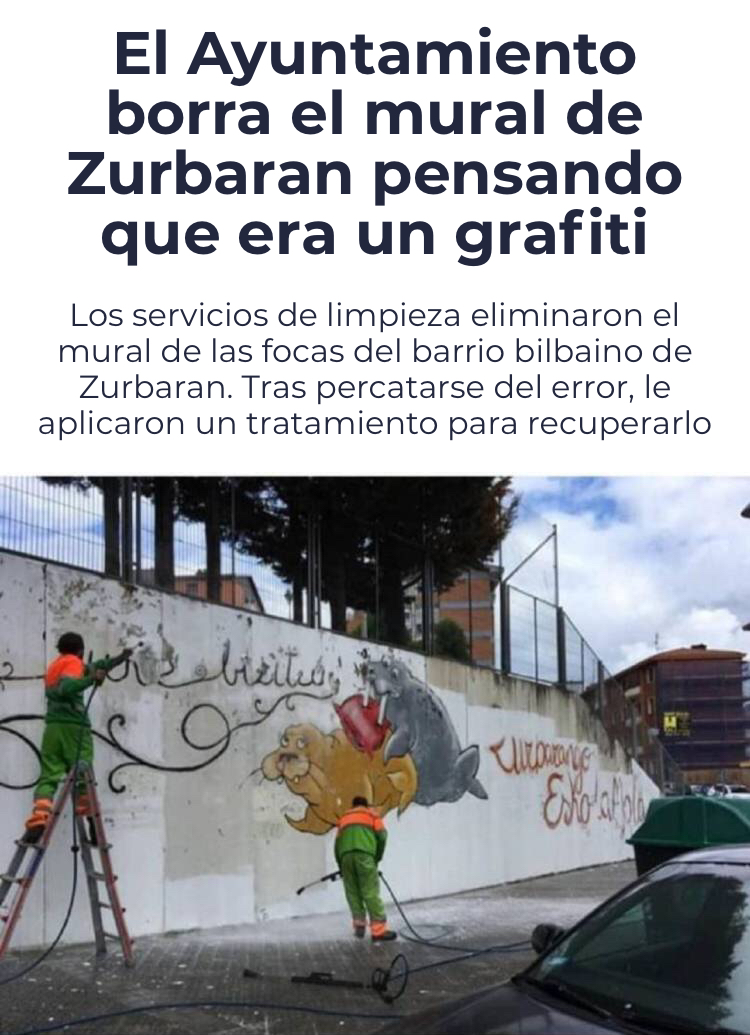 El Ayuntamiento de Bilbao ha borrado uno de los murales más emblemáticos de Zurbaran al pensar que era un simple grafiti. El dibujo, situado en el colego público del barrio, muestra dos focas y tenía gran carga de simbolismo, según el vecindario de la zona.