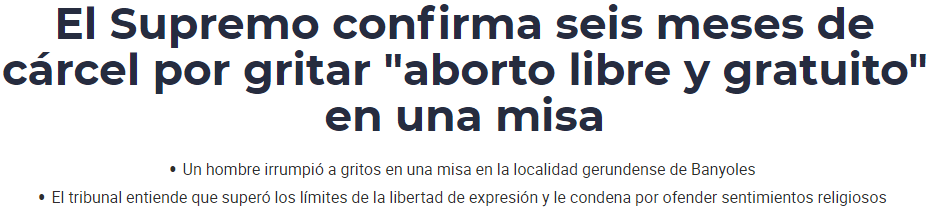 […] El Tribunal Supremo ha confirmado una condena de seis meses de prisión para un hombre que en 2014 entró en una iglesia de Girona gritando a favor del aborto, colocando una pancarta en el altar donde decía «fuera rosarios de nuestros ovarios» y lanzando pasquines. Los jueces le atribuyen un derecho contra los sentimientos religiosos al entender que se extralimitó en el uso de su libertad de expresión. […]
