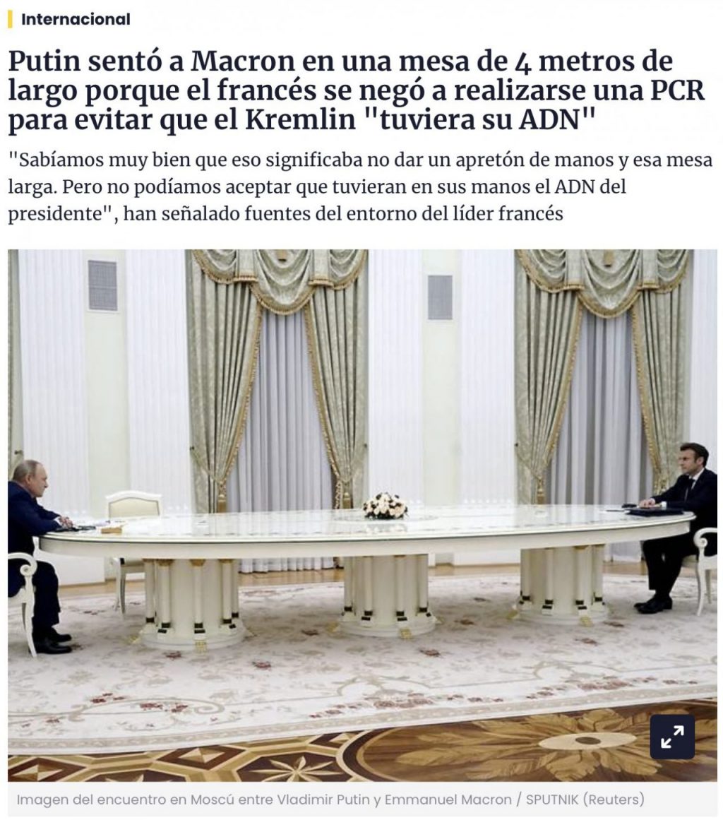 Sin embargo, los motivos han sido otros. Según ha señalado la agencia internacional Reuters, Macron rechazó una solicitud del Kremlin de hacerse una prueba PCR rusa cuando llegó para ver a Putin esta semana y, por lo tanto, se mantuvo alejado del líder ruso. | @cadenaser