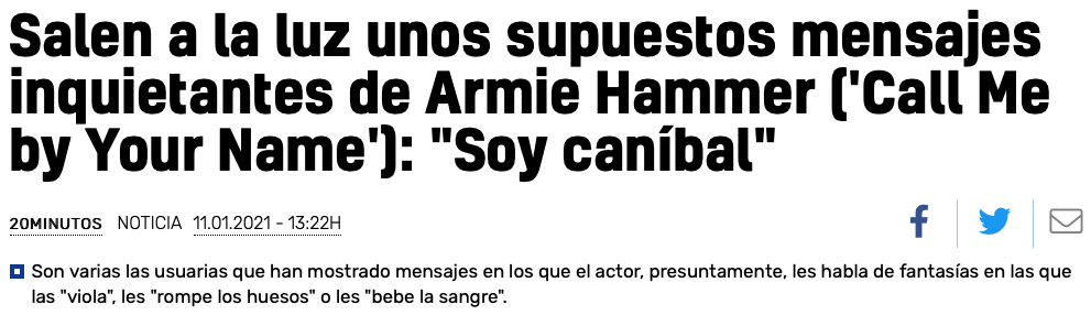 No me importaría que me coma el cerebro y me rompa los huesos jeje… [bromitas OFF] Voy a dar mi corta opinión sobre el asunto. No he investigado en profundidad esta noticia, pero de lo que he visto me inclino más a pensar que Armie Hammer tiene unos fetiches rarunos y ya. Ha mantenido estas conversaciones con las chicas «FANTASEANDO» y no creo que lo hubiera hecho en la vida real. Si fuera un asesino loco, para empezar yo creo que no usaría su CUENTA OFICIAL para mandar esos mensajes y audios… Ale, a destruirle la vida a un actor joven porque se pajea pensando en cerebros y sangre.