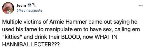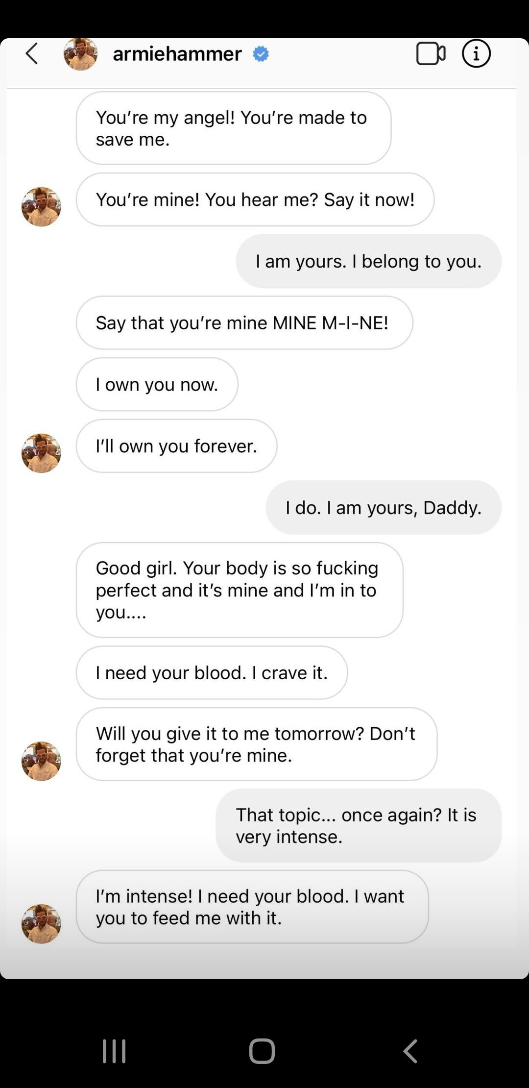 «Múltiples víctimas de Armie Hamer han revelado que usaba su fama para manipularlas para tener sexo, llamándolas ‘gatitas’ y diciéndoles que quería beberse su sangre«, reveló un tuitero que este domingo hizo un hilo mostrando todas las capturas que tenía de diferentes usuarias.
