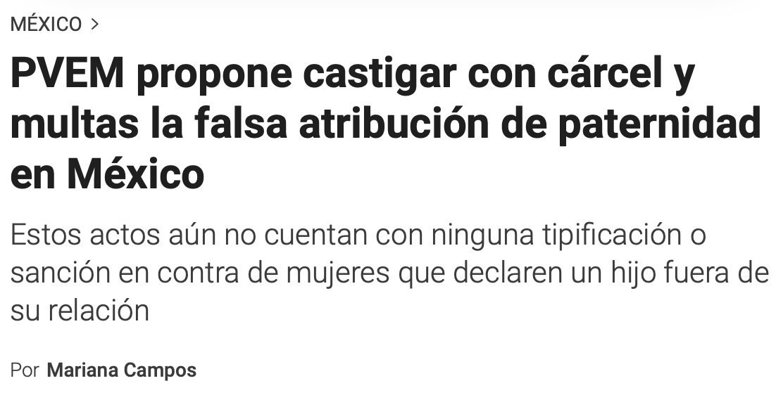 En una propuesta sin precedentes, el Partido Verde Ecologista de México (PVEM) planteó la adición de un nuevo delito en el Código Penal Federal con el que se busca castigar a las mujeres que atribuyan falsamente la paternidad de un menor a un hombre que no sea su progenitor biológico con fines lucrativos.