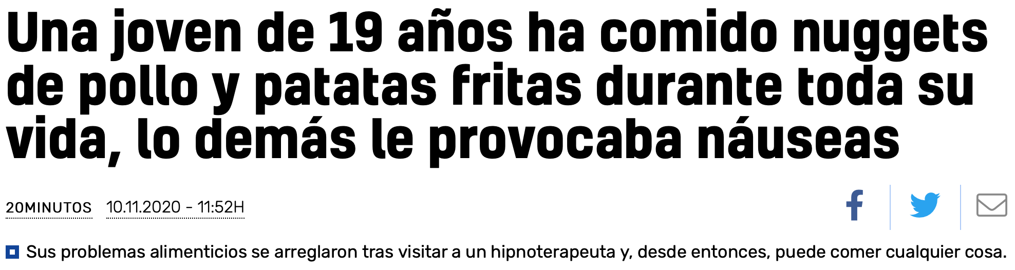 Acudieron a un hipnotizador y, desde su visita, milagrosamente, Rebecca puede comer frutas, verduras y todo tipo de alimentos. «Era escéptica sobre la hipnosis, pero hasta ahora parece haberme ayudado. Desde que asistí a mi primera sesión, he podido probar al menos dos alimentos nuevos todos los días y mi objetivo es poder comer un asado», comenta orgullosa la joven. | @20minutos