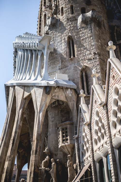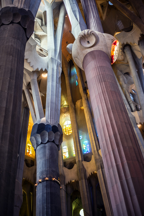 No hay ni una sola línea recta en el interior de la Sagrada Familia: todo está construido imitando la arquitectura de la naturaleza. (“La recta es del hombre; la curva es de Dios”, dijo Gaudí). Las columnas que sostienen el templo emulan árboles que se alzan del suelo al techo y cuya trayectoria de crecimiento está calculada aritméticamente.