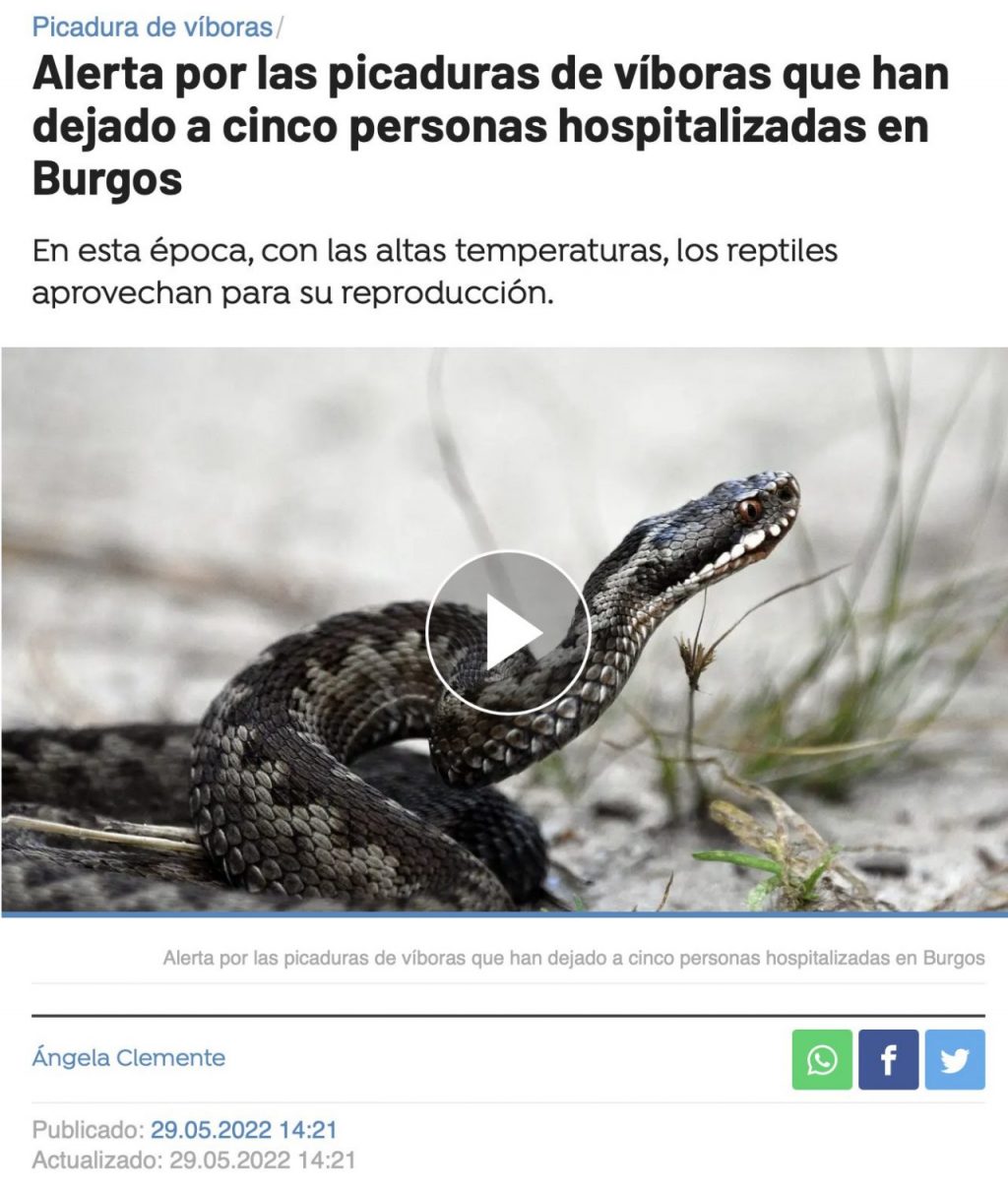 Cinco personas permanecen hospitalizadas en Burgos por picaduras de víbora, tres de ellas han tenido que ser tratadas con antídotos y es que, esta época en la que empieza a hacer calor, es la que aprovechan los reptiles para su reproducción. Las autoridades recomiendan extremar las precauciones y, en caso de encontrarse con una, alejarse con prudencia y, sobre todo, no intentar cogerla. | @antena3