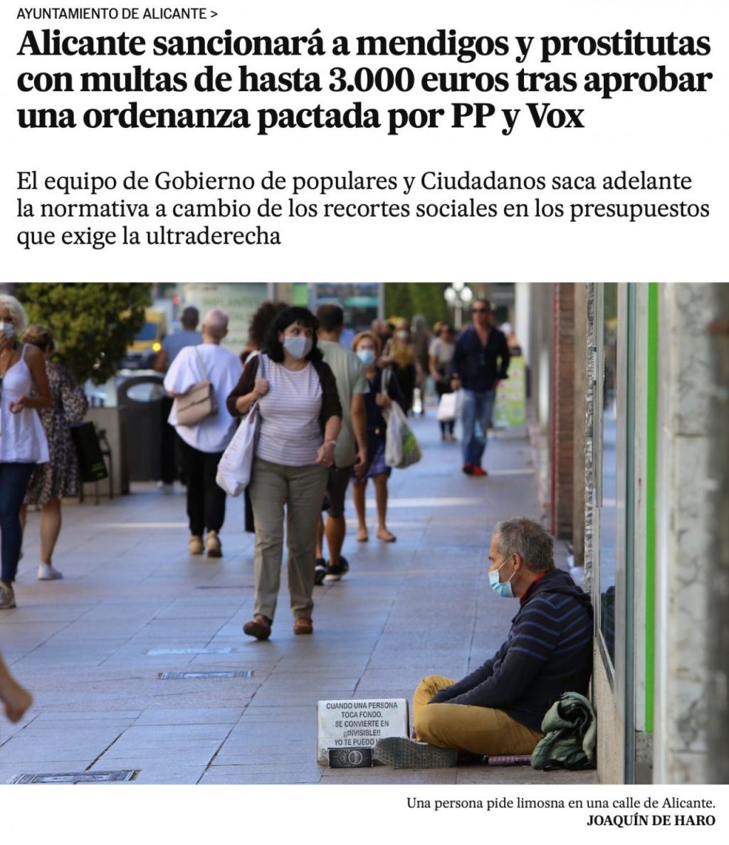Llevar a cabo prácticas sexuales y ofrecer, solicitar, negociar y aceptar directa o indirectamente servicios sexuales en Alicante conllevará a partir de ahora una multa de 750 a 1.500 euros. La realización de conductas que, bajo apariencia de mendicidad, representen actitudes coactivas o de acoso, también. Si la mendicidad se practica con menores o de personas con discapacidad, la sanción subirá hasta los 3.000 euros. Prostitutas, mendigos y personas sin hogar podrán ser multadas por la Policía Local alicantina, tras la aprobación de una ordenanza municipal de convivencia cívica pactada por el equipo de Gobierno del Consistorio (PP y Cs) con Vox. A cambio, el partido de ultraderecha apoyará los próximos presupuestos municipales, que padecerán un considerable recorte de ayudas sociales. | @elpais
