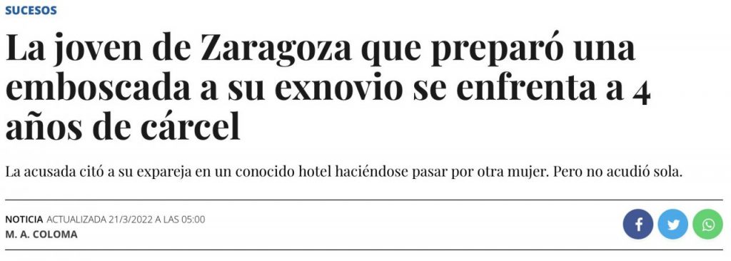 El Juzgado de Instrucción número 2 de Zaragoza acaba de dar por concluidas las pesquisas contra Sandra María P. H., la joven detenida a finales del pasado año por preparar una emboscada a su exnovio, al que citó en un céntrico hotel haciéndose pasar por otra mujer. El hombre reservó una habitación, pero sus planes no salieron como tenía previsto. Es más, la cama en la que terminó durmiendo aquella noche fue la de un hospital, ya que recibió una brutal paliza de la que tardó casi un mes en recuperarse.