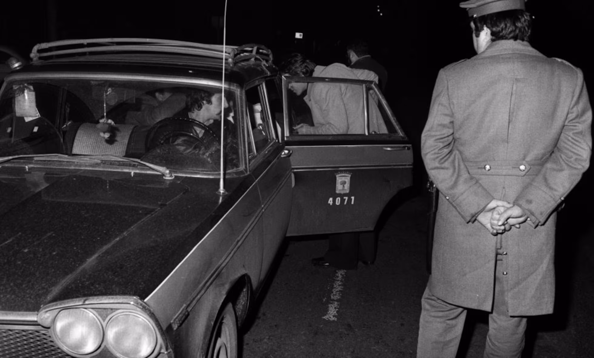 Unos clientes suben a un taxi ante la mirada de un agente de la Policía Armada en 1978 en Madrid.