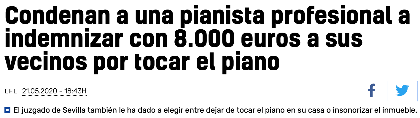 […] Un juzgado de Sevilla ha condenado a una pianista profesional a elegir entre dejar de tocar el piano en su casa o insonorizar el inmueble, así como a indemnizar con 8.000 euros a una pareja de vecinos, al considerar que vulneró el derecho fundamental de los demandantes a la intimidad personal y familiar. […] @20minutos