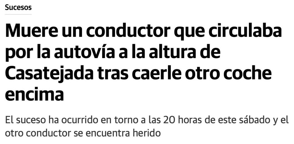 Una casualidad fatal se ha cobrado este sábado la vida de un hombre de 29 años de edad. Se trata de un conductor que ha muerto en la tarde de este 18 de junio cuando circulaba por la EX-A1, la conocida como autovía del Norte de Extremadura que une Navalmoral con Plasencia, tras caerle un coche encima desde la vía del cambio de sentido. El hombre que iba en ese otro vehículo, de 25 años de edad, se encuentra en estado crítico, según los datos aportados por el Centro de Urgencias y Emergencias 112 de Extremadura. Ha sufrido politraumatismos y ha sido trasladado al hospital Campo Arañuelo de Navalmoral para recibir atención médica.