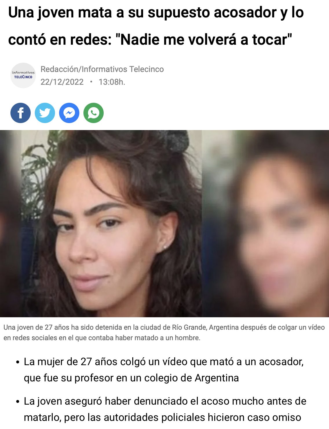 Una joven de 27 años ha sido detenida en la ciudad de Río Grande, Argentinadespués de colgar un vídeo en redes sociales en el que contaba haber matado a un hombre, que supuestamente la acosaba sexualmente y amenazaba a su familia.