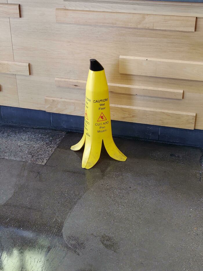 Me pareció que esta era una forma muy inteligente de hacer una señal de precaución. Sigue siendo muy visible y cumple su función, pero con algo de diversión. Además, estaba en una tienda de zumos, así que tiene sentido con su estética