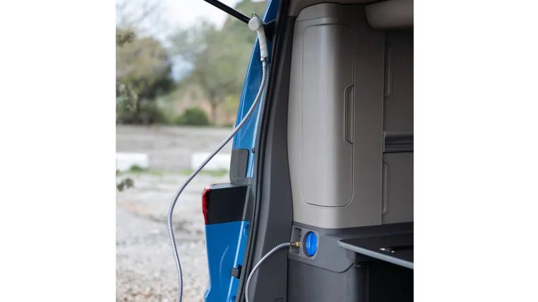 Por último, la Ocean tiene cuatro plazas y está equipado con numerosos detalles adicionales de serie, como el techo elevable eléctrico, toldo en el lado izquierdo, puertas correderas con cierre asistido, segunda y tercera batería adicional con transformador de tensión de bajo voltaje, cocina de verano con mesa plegable extraíble (que también puede utilizarse en el interior y como prolongación de la encimera), armarios, nevera y fregadero.