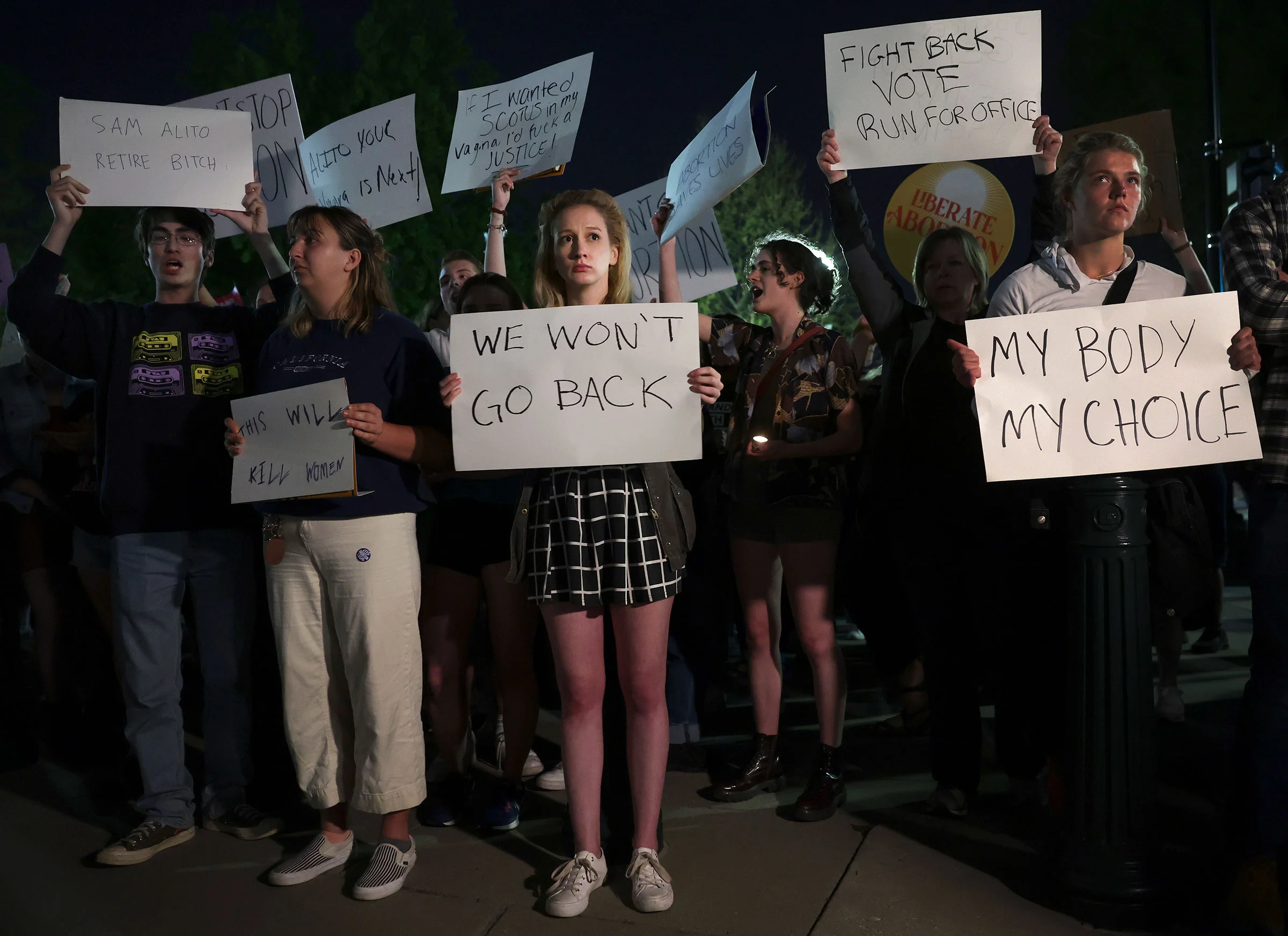 Activistas a favor del derecho a decidir y en contra del aborto mitin frente a la Corte Suprema de EE. UU. en Washington el 2 de mayo, luego de la publicación de un borrador inicial de opinión mayoritaria obtenido por Politico, donde el juez de la Corte Suprema Samuel Alito supuestamente escribió que los casos Roe v. Wade y Planned Parenthood of Southeastern Pennsylvania v. Casey debe anularse.