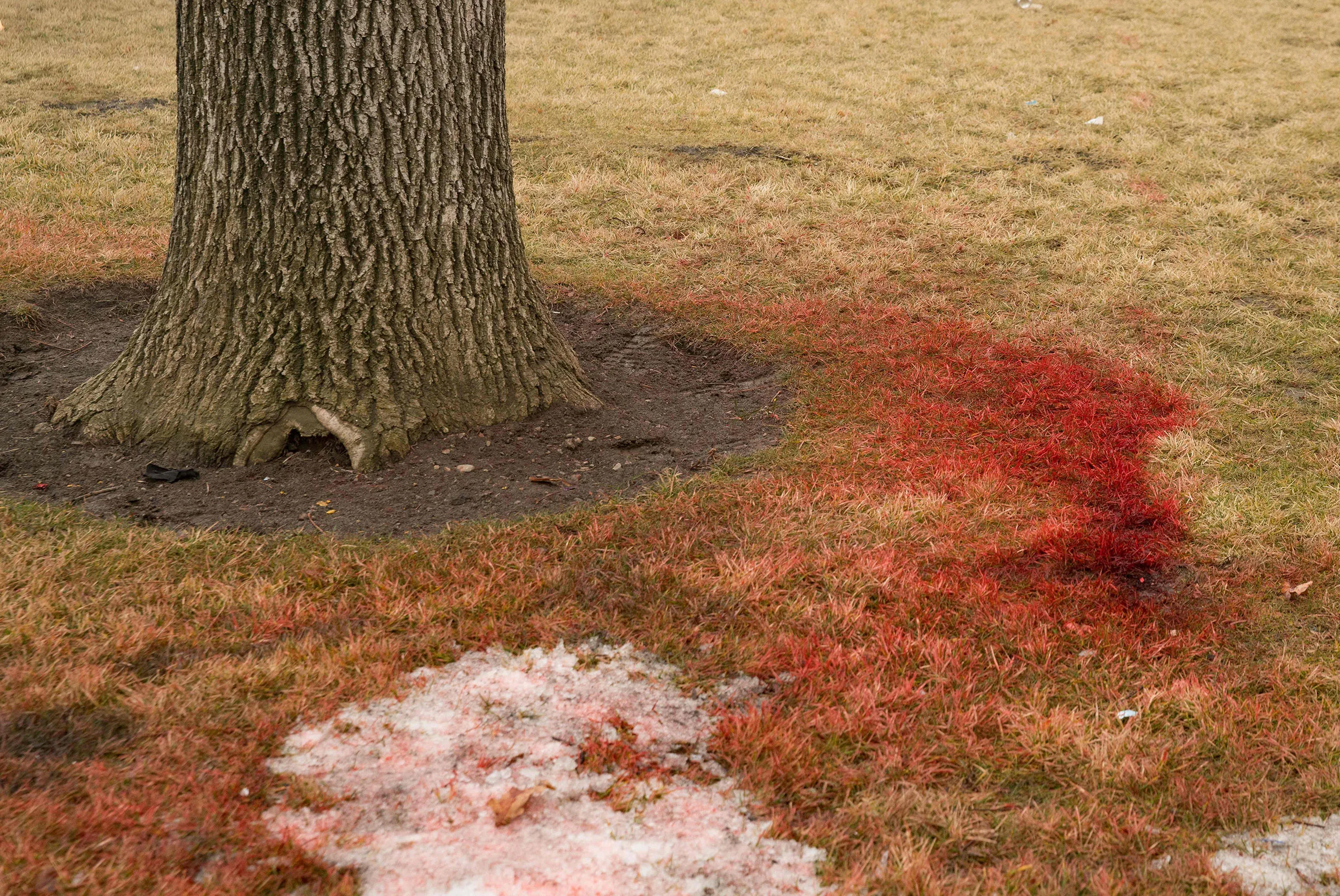 Sangre en un césped junto a la acera en el centro de Almaty, Kazajstán, el 6 de enero, después de que estallara la violencia tras las protestas por el aumento de los precios del combustible.