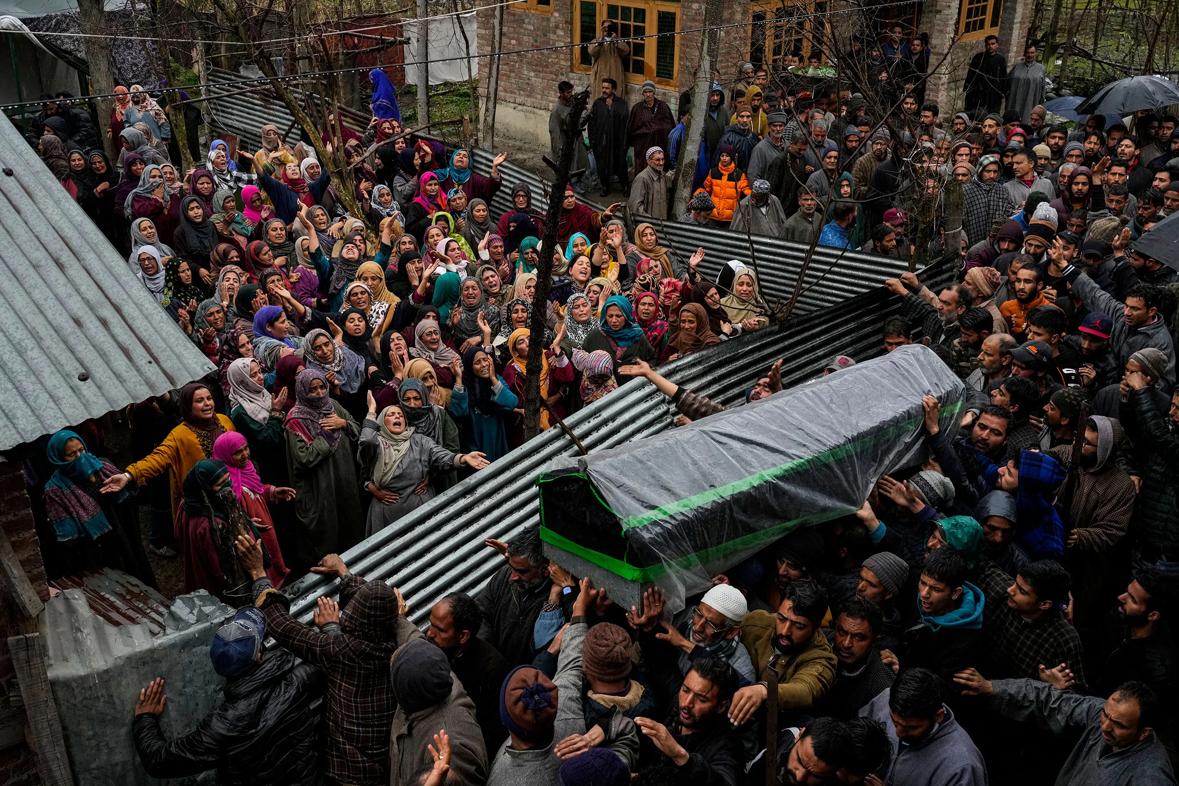 Familiares y parientes lloran mientras cargan el cuerpo de Rafia Nazir, una joven cachemira muerta en un ataque con granadas, durante su funeral en Srinagar, Cachemira india, el 7 de marzo.