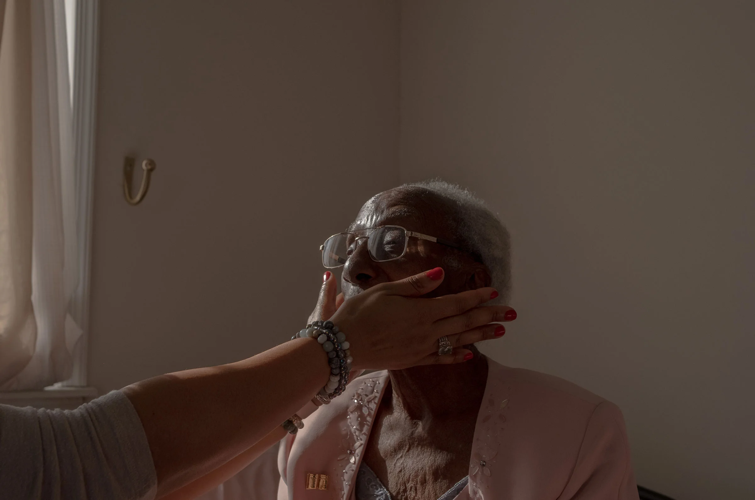 La doula al final de su vida, Michelle Thornhill, se reúne con su cliente, Estella Stackhouse, de 101 años, en la casa de Stackhouse en Filadelfia, el 19 de enero.