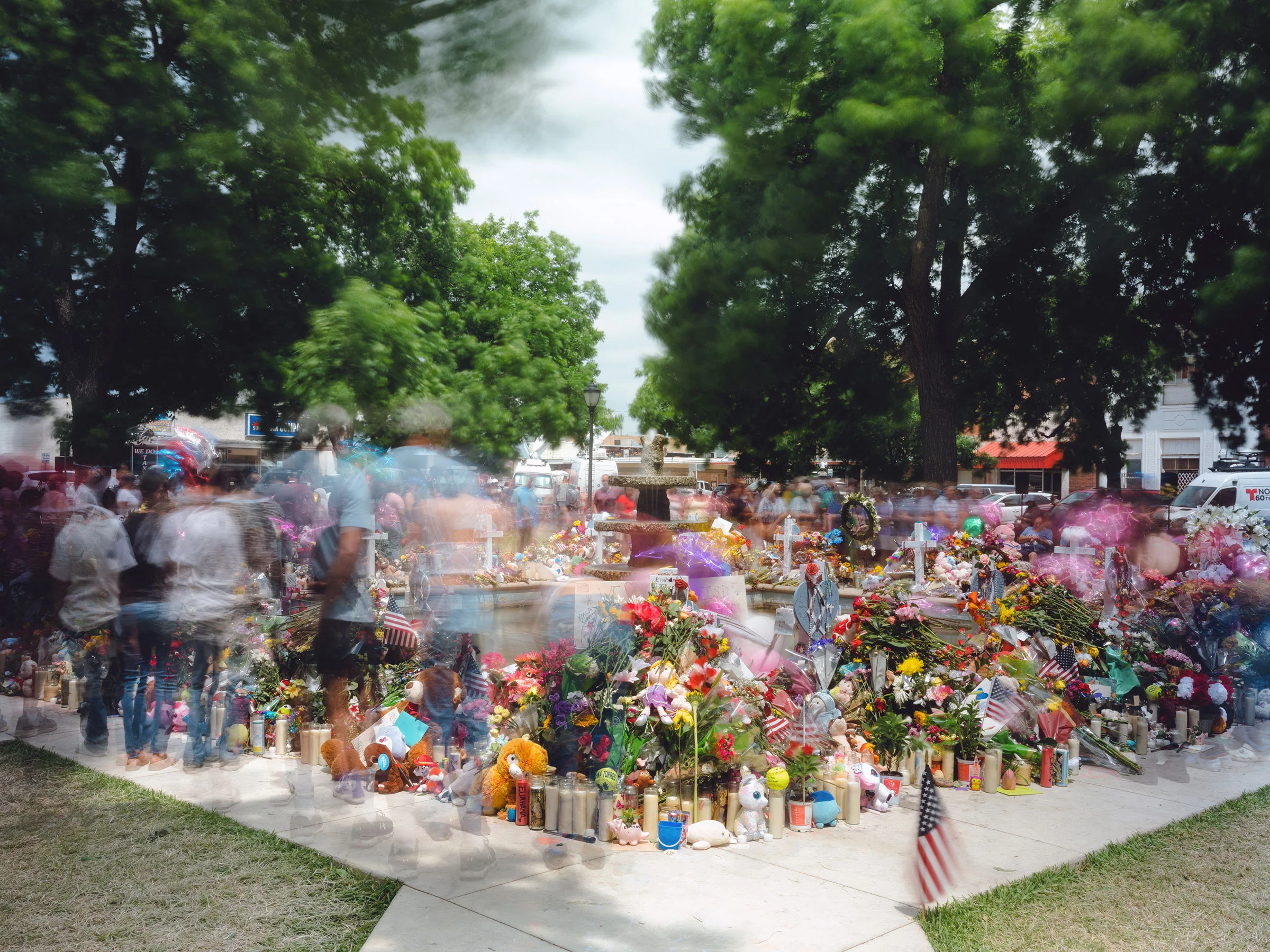 Los dolientes visitan el monumento a las víctimas del tiroteo en la escuela Uvalde en la plaza del pueblo de Uvalde, Texas, el 30 de mayo. En total, 21 personas, 19 estudiantes y dos maestros, fueron asesinados por un hombre armado en la Escuela Primaria Robb el 24 de mayo.