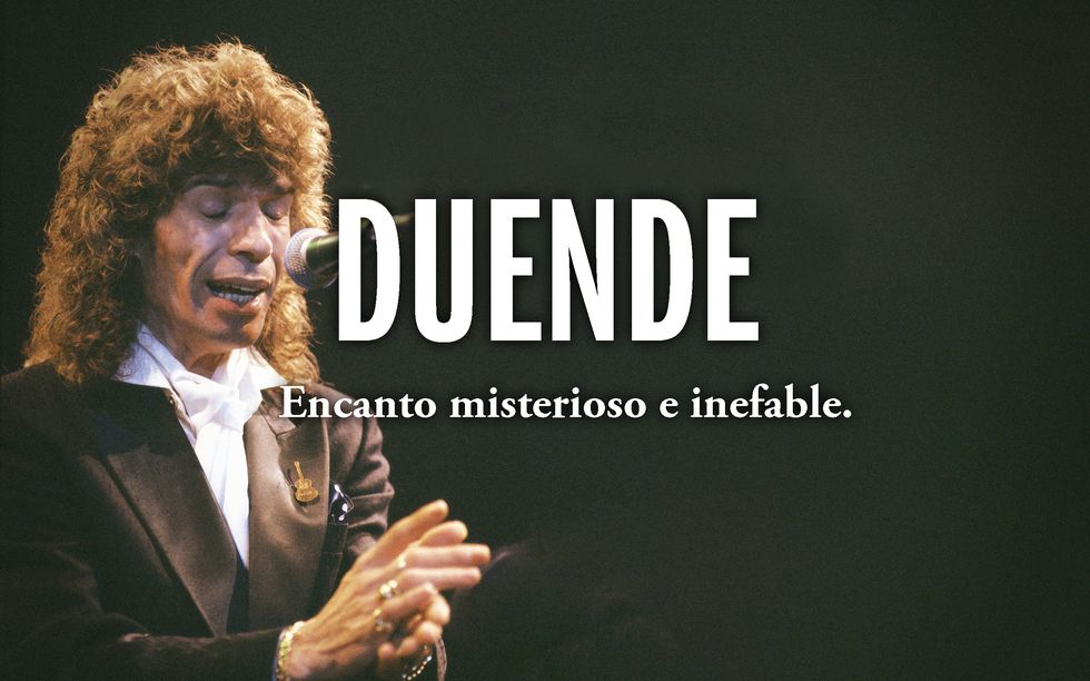 En su primera acepción es un espíritu fantástico, con figura de viejo o de niño en las narraciones tradicionales, que habita en algunas casas y causa en ellas trastorno y estruendo. Proviene de «dueño de» la casa… Es el alma del flamenco. Federico García Lorca ya explicaba en 1933 en su conferencia «Teoría y juego del duende»: «El duende es un poder y no un obrar, es un luchar y no pensar. Yo he oído decir a un viejo maestro guitarrista: ‘El duende no está en la garganta; el duende sube por dentro desde la planta de los pies’. Es decir, no es cuestión de facultad, sino de verdadero estilo vivo; es decir, de sangre; es decir, de viejísima cultura, de creación en acto”.