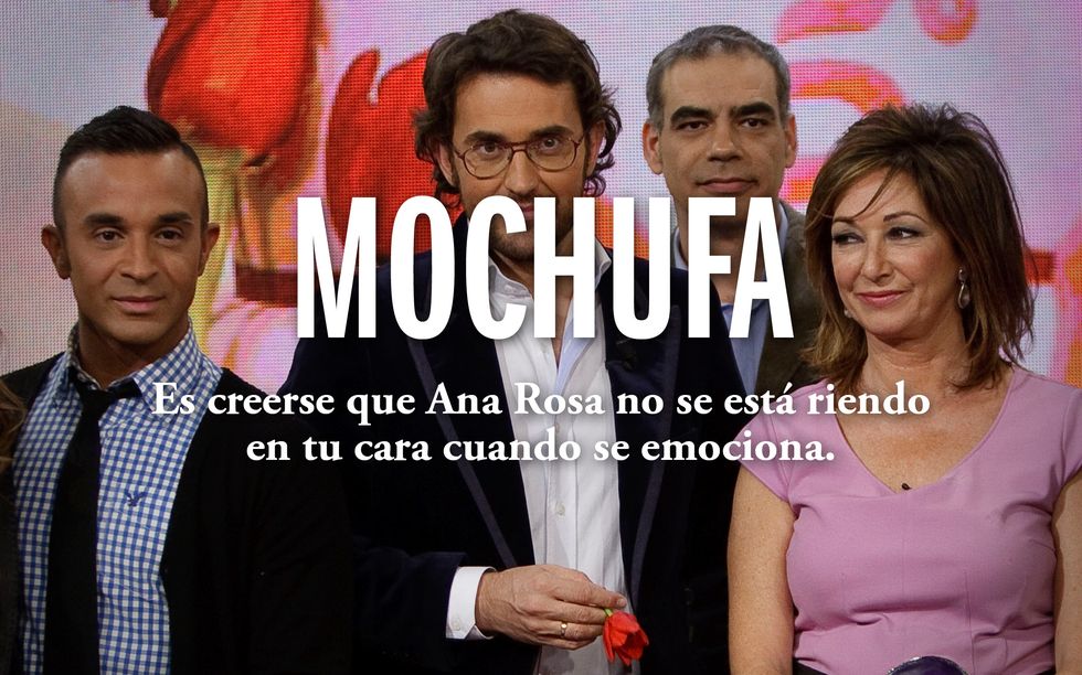 Según el Diccionario de Santiago Lorenzo, publicado por Letras Corsarias a partir de sus libros y entrevistas, como esta que le hice hace unos días. En Las ganasaparece por primera vez el término: «Gorrinillos que se emocionan con las folclóricas, que lloran en el fútbol y en los telemaratones. Que votan a líderes con salero con cojones, valores predilectos de los lisiados de la vida que parecen necesitar que sus candidatos les roben (…) Al estamento de los del beriberi mental le llamaron la mochufa». Genial. No obstante, a mí me gusta especialmente esta acepción: «ser mochufa es creerse que Ana Rosa no se está riendo en tu cara cuando se emociona».