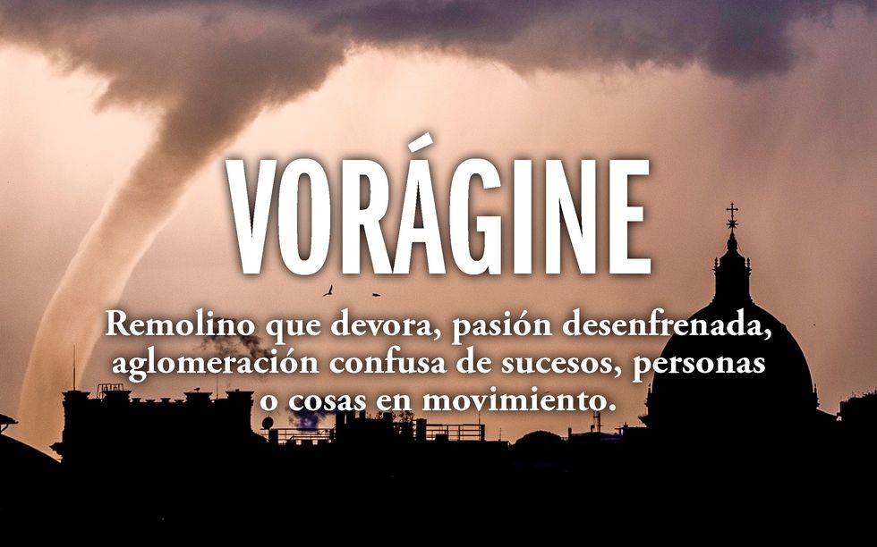 Proviene del latín vorago, voraginis, que significa «remolino» o «abismo», que a su vez deriva del verbo vorare, que significa «tragar» y dio origen a palabras como «devorar» o «voraz». Por tanto, la vorágine es aquello que se lo traga todo.