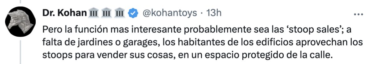 Tradicionalmente, en las ciudades de América del Norte, la escalera de entrada cumplía una función importante como lugar para encuentros sociales breves e incidentales. Las amas de casa, los niños y otros miembros del hogar se sentaban en la escalera de entrada fuera de su casa para relajarse y saludar a los vecinos que pasaban. De manera similar, mientras se hacía un recado, uno se detenía y conversaba con los vecinos sentados en sus escaleras. En una comunidad urbana, las conversaciones en las escalinatas contribuían a difundir chismes y reafirmar las relaciones casuales. De manera similar, era el lugar donde los niños se reunían para jugar a juegos callejeros como el stoop ball. Los habitantes de las ciudades que carecen de patios suelen celebrar ventas en las escalinatas en lugar de las ventas de garaje.