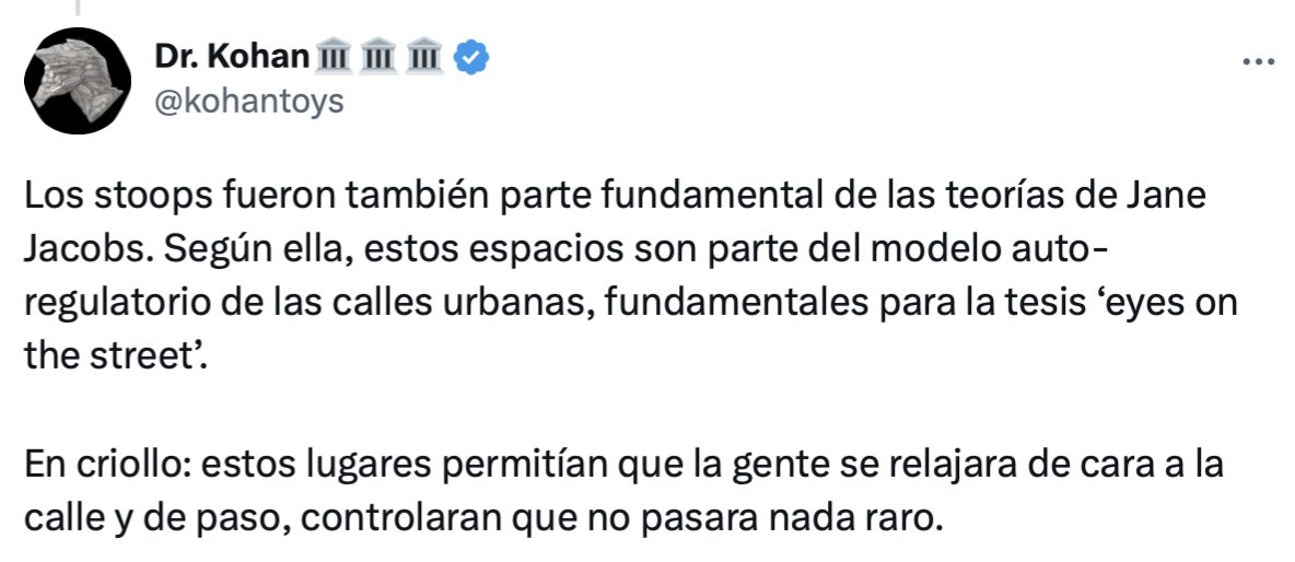 En su libro fundamental The Death and Life of Great American Cities, Jane Jacobs incluye la escalinata como parte de su modelo de la calle urbana autorregulada. Al proporcionar una presencia humana constante que vigila la calle, instituciones como las escalinatas previenen el crimen callejero, sin la intervención de figuras de autoridad. Además, motivan un mejor mantenimiento y embellecimiento de las calles, al otorgarles un valor social y utilitario.