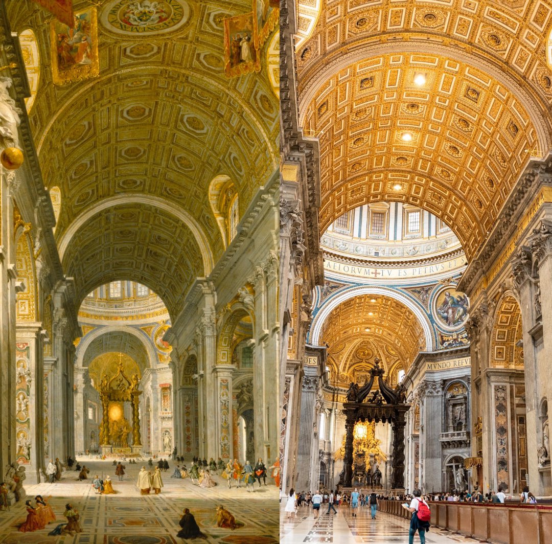 Desde 1750 casi nada ha cambiado en el interior de la Basílica de San Pedro, excepto la vestimenta de los visitantes.