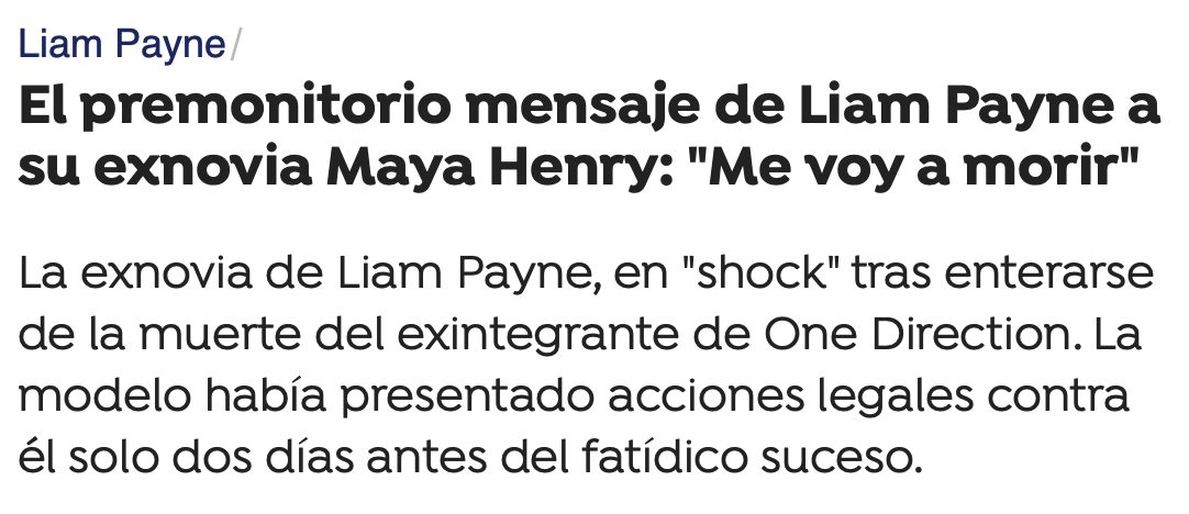 Curiosamente, en los días previos a su fallecimiento, Maya había comentado a través de una entrevista en el podcast ‘The Internet Is Dead’ publicada por ‘Page Six’ que Liam Payne ya había anticipado su muerte en varias ocasiones. “Siempre decía: ‘No me siento bien’ y jugaba con la idea de la muerte”, “Me voy a morir”, relataba Henry. Estos mensajes, que Maya describió como “tácticas manipuladoras”, buscaban, según ella, mantenerla emocionalmente atada al cantante. | @antena3