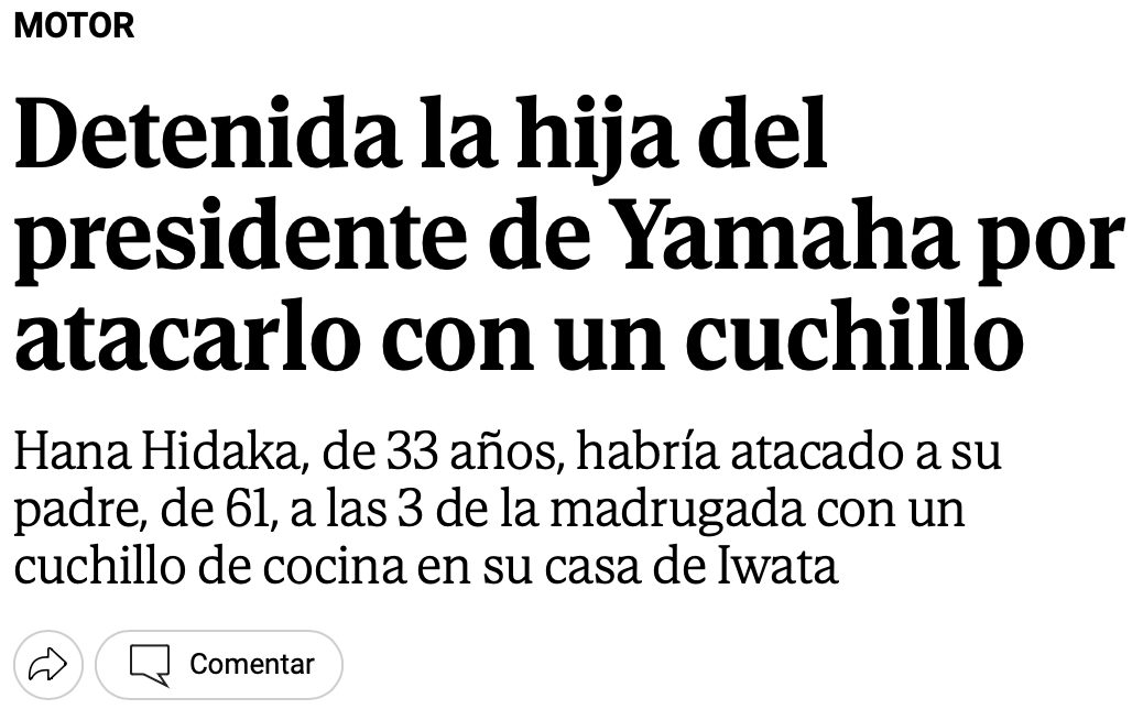 Hana Hidaka, de 33 años, habría atacado a su padre, de 61, a las 3 de la madrugada hora local (18:00 GMT del lunes) con un cuchillo de cocina en su casa de Iwata, en la prefectura de Shizuoka (centro de Japón), donde tiene la sede Yamaha.