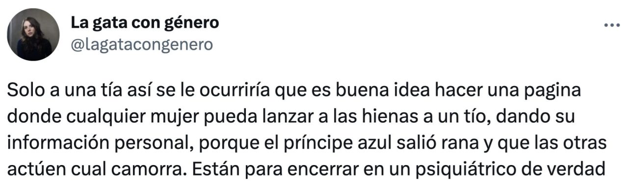 Solo a una tía así se le ocurriría que es buena idea hacer una pagina donde cualquier mujer pueda lanzar a las hienas a un tío, dando su información personal, porque el príncipe azul salió rana y que las otras actúen cual camorra. Están para encerrar en un psiquiátrico de verdad pic.twitter.com/M9KArglnzZ