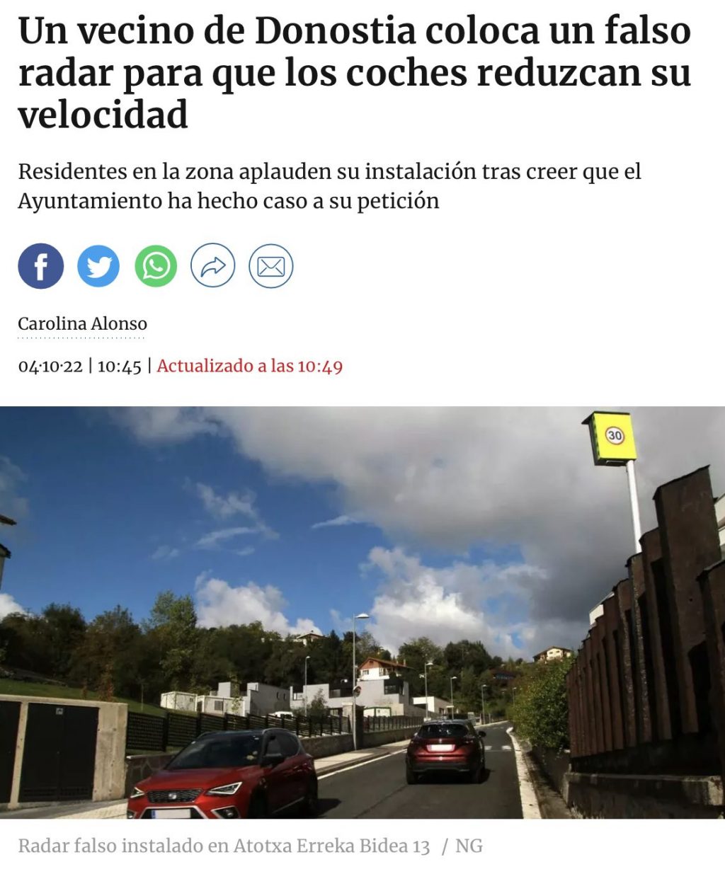 La aparición de un radar de control de velocidad en la zona de Atotxa Erreka, que resultó ser falso, fue aplaudido por un grupo de vecinos, que creyeron inicialmente que era real, mientras que fue criticado por otros. El nuevo barrio de Donostia, situado en una ladera, con una carretera en cuesta se ha ido poblando en los últimos años.