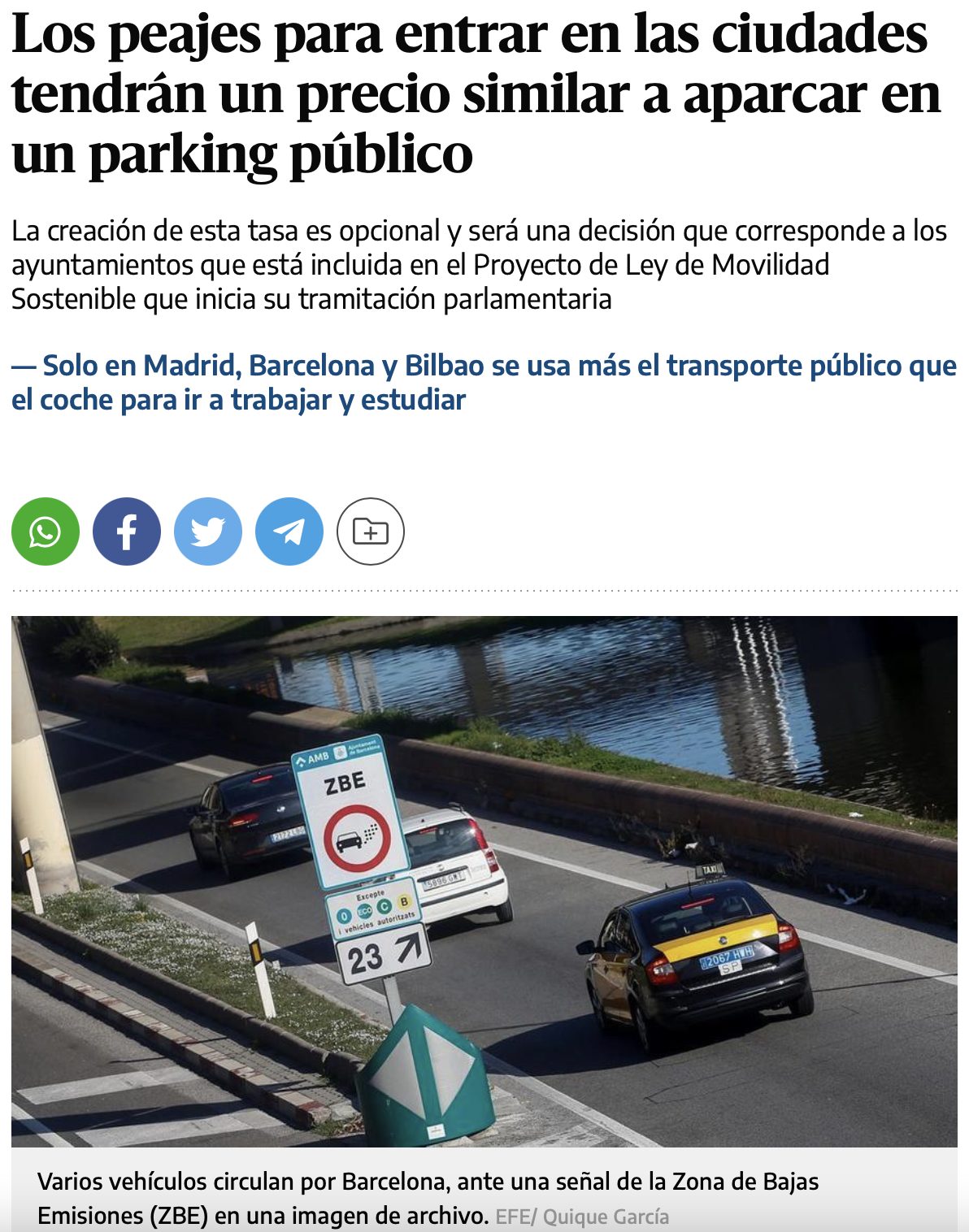 La futura tasa que los ayuntamientos podrán crear para cobrar a los vehículos que accedan a las Zonas de Bajas Emisiones (ZBE) de las ciudades tendrá un precio similar al coste de aparcar en un párking público en ese mismo municipio, según recoge Europa Press. | @eldiario