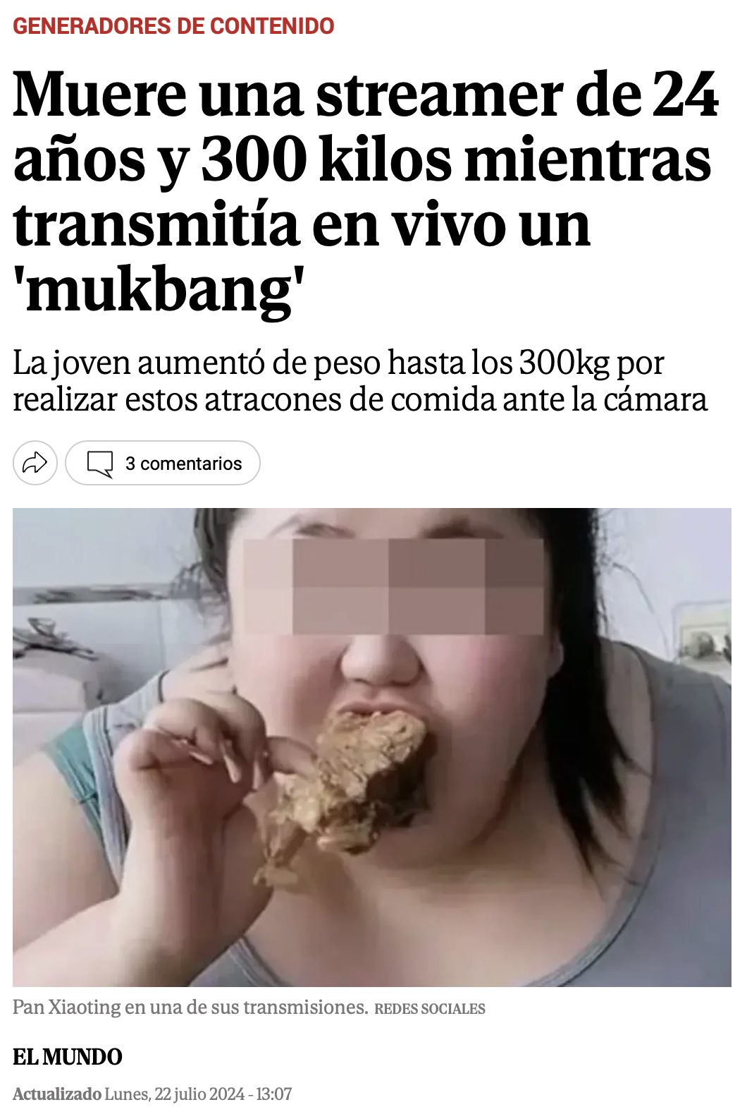 En sus streams aceptaba desafíos de comer durante más de 10 horas seguidas y cantidades que rebasaban los 10 kg de alimento, lo que sin duda afectó su salud. | @elmundo