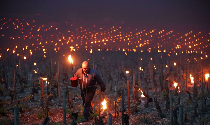 Los agricultores franceses utilizan el fuego para intentar salvar sus viñedos durante las noches frías