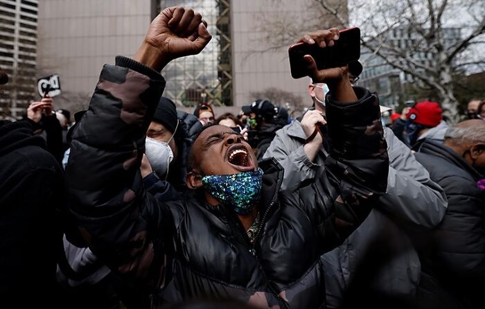 Un hombre fuera del juzgado se entera de que Derek Chauvin fue declarado culpable de los tres cargos