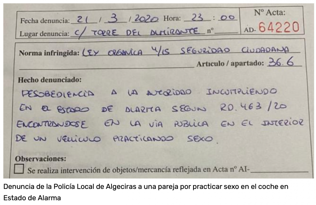 […] La Policía Local de Algeciras (Cádiz) multó el pasado sábado a las 23.00 horas de la noche a una pareja que se encontraba en la vía pública en el interior de un coche «practicando sexo», incumpliendo así el estado de alarma decretado para frenar la propagación del coronavirus. […] @20minutos