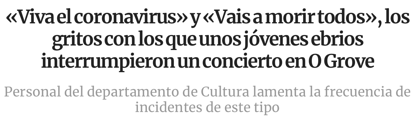 Los jueves por la noche, en O Grove suena la música. Dentro de un ciclo organizado por el Concello, anoche se subieron al escenario de la plaza de O Corgo los integrantes del grupo local Fla-Meco. Estaba siendo una noche «espectacular» cuando un grupo de jóvenes, comenzaron a deambular entre las sillas del público. Según relatan trabajadores del servicio de cultura -primero lo hicieron, por error, en la página oficial de la concejalía en Facebook-, iban sin mascarilla y no paraban de gritar «viva el coronavirus» y «vais a morir todos». Según relata el alcalde, José Cacabelos (PSOE), «alardeaban de que habían venido de Madrid, y de que iban a contagiar a todo el mundo».