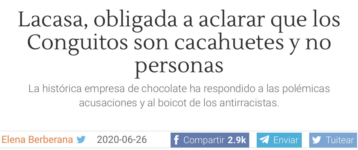 […] Libre Mercado ha contactado con Lacasa. La empresa ha respondido a las duras acusaciones de los radicales, que ya pretenden buscar el boicot y dañar al popular dulce de chocolate español. La compañía de chocolate de Jaca ha aclarado que el Conguito representa a la mascota de la marca y especifica que se trata de cacahuetes y no de personas. […] @libremercado