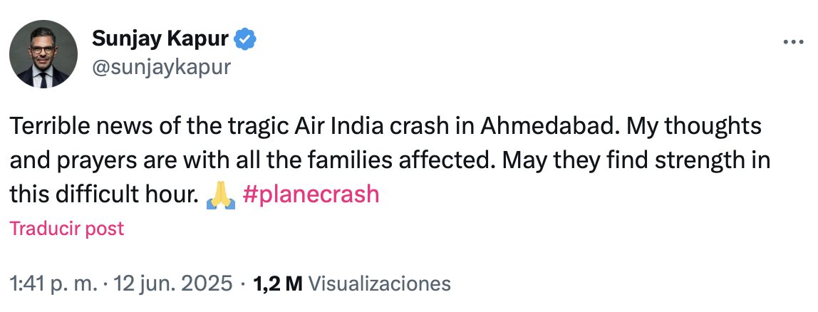 Curiosamente, poco antes de morir, Kapur compartió en X (la red social antes conocida como Twitter) un mensaje de condolencias para las víctimas del accidente de Air India. Fue su último tuit.