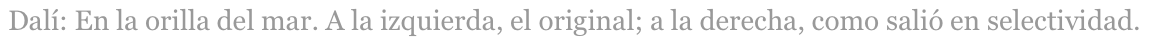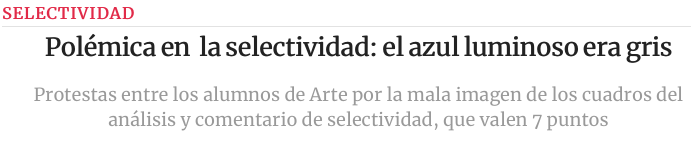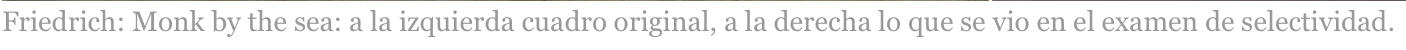 […] Ni el azul era brillante ni las pinceladas secas. La mala calidad de las imágenes del examen de Fundamentos del Arte en selectividad le puede costar a los alumnos hasta 7 puntos, el suspenso seguro, porque la obra de Caspar David Friedrich Monk by the sea es totalmente diferente en el original a lo que esta mañana vieron los más de 1.000 estudiantes de la asignatura. También la obra anexa, En la orilla del mar de Dalí tenía desajustes de color y textura entre el original y lo que tuvieron que comentar los jóvenes, aunque no con la llamativa diferencia del pintor romántico alemán. […]