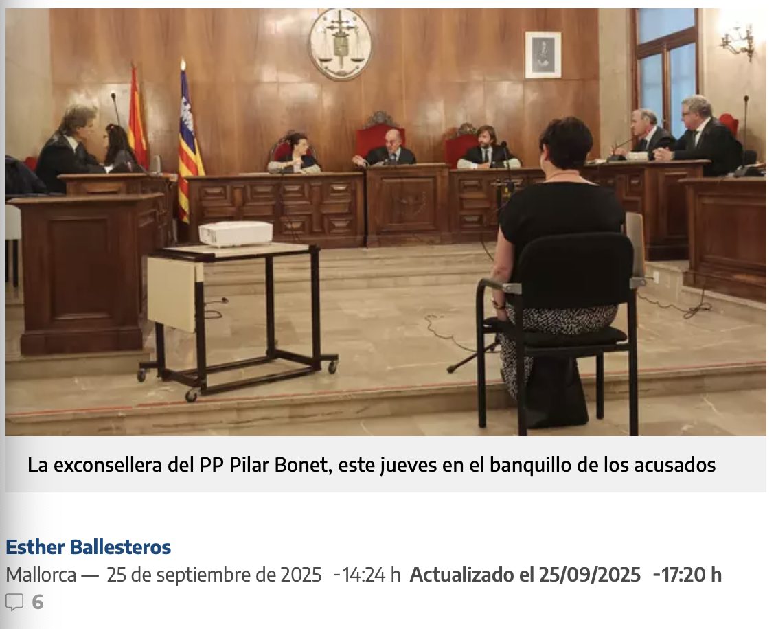 Pilar Bonet, la consellera del PP en Mallorca que dimitió el año pasado a raíz del desfalco de 2,2 millones de euros cuando trabajaba en la filial de handling de una compañía aérea, ha reconocido formalmente los hechos ante la Audiencia Provincial de Balears y ha aceptado una condena de dos años y medio de prisión y el pago de una multa de 1.250 euros por un delito de falsedad documental en concurso con otro de estafa. También deberá indemnizar a la empresa en las cantidades que defraudó de la misma. La acusada atribuye su conducta a una grave adicción a las compras que, alega, la llevó a adquirir y regalar enseres de forma compulsiva con cargo a los fondos de la aerolínea. | @eldiario