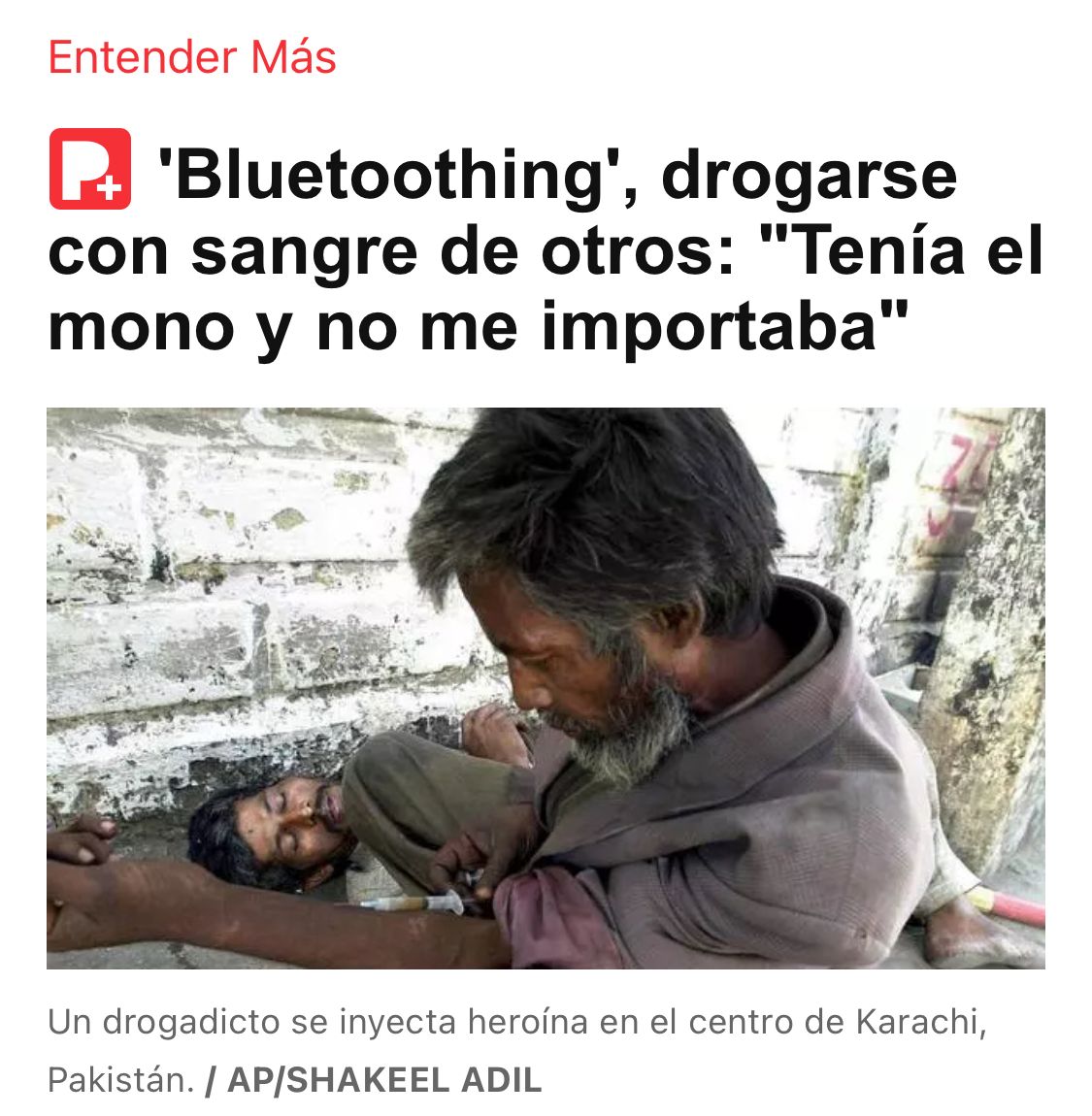 Para practicar ‘bluetoothing’, un primer consumidor se inyecta una droga como heroína o metanfetamina. Luego, la sangre de esa persona —ya mezclada con la droga— se inyecta en otro consumidor, con la esperanza de colocarse con la misma dosis, de forma más barata. Dos al precio de uno. No se conoce la dimensión del fenómeno a nivel mundial pero sí se sabe que está extendido a algunos países africanos y ha merecido ya la atención de medios internacionales como los diarios ‘The New York Times’ ‘The Guardian’, las cadenas de televisión británicas Sky News y BBC o la australiana ABC, entre otros, y de investigadores y autoridades sanitarias mundiales por el altísimo potencial que tiene en la propagación de enfermedades como el sida o la hepatitis. | @elperiodico