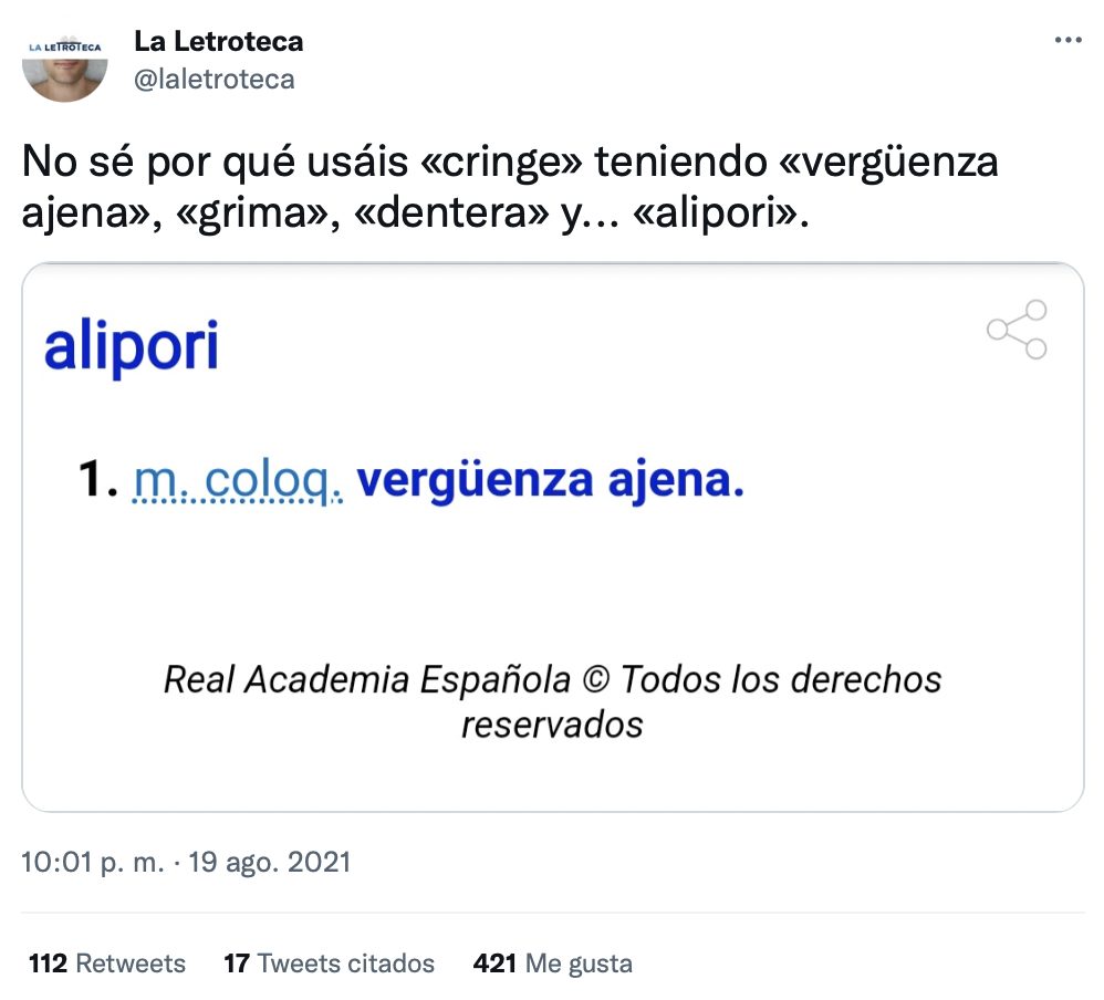 Explico, «vergüenza ajena» es demasiado largo, «grima» suena mal, «dentera» no significa exactamente «cringe» y «alipori» lo desconocía. Me encanta. A partir ahora usaré alipori. @laletroteca aliporicringe No hay comentarios random 5 diciembre, 2022