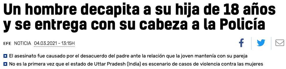 «El acusado vio a su hija en una posición comprometedora con un hombre joven y, al verlo, perdió la calma y decapitó a su propia hija», ha especificado Anurag Vats, el superintendente de Policía del distrito de Hardoi donde tuvo lugar ayer el suceso. | @20minutos