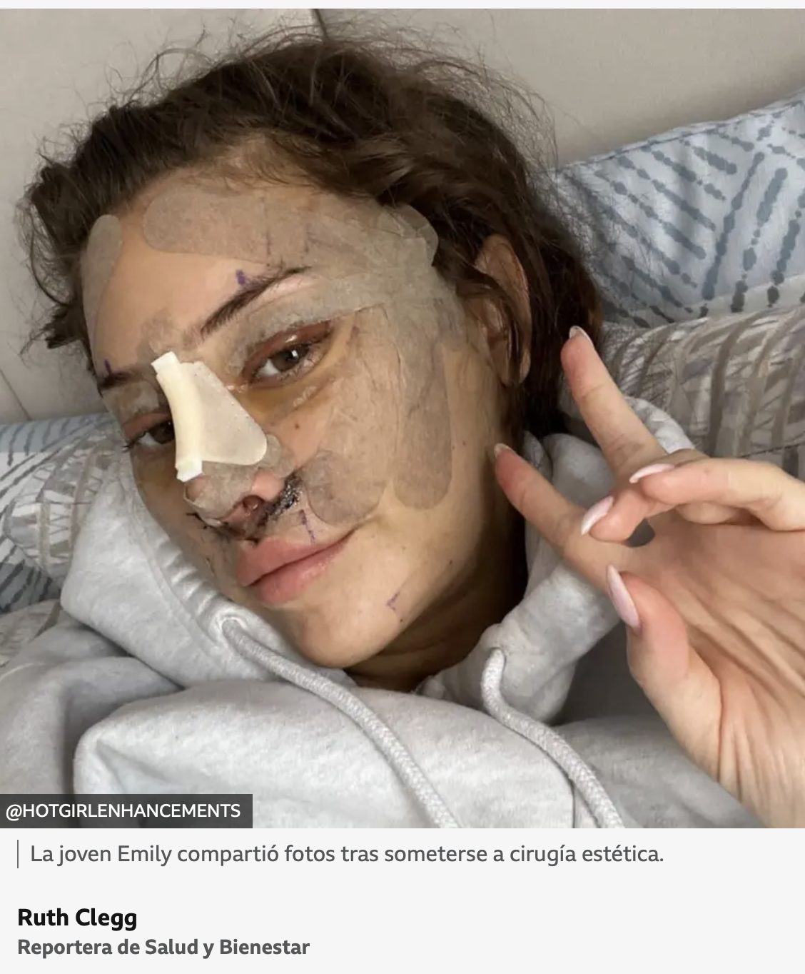 Al describir el proceso, esta empresaria de Toronto, Canadá, cuenta que el cirujano puso su canción favorita mientras le aplicaban la anestesia general y luego: «Me quedé dormida y me desperté, vomité, y tenía una cara y una nariz nuevas».