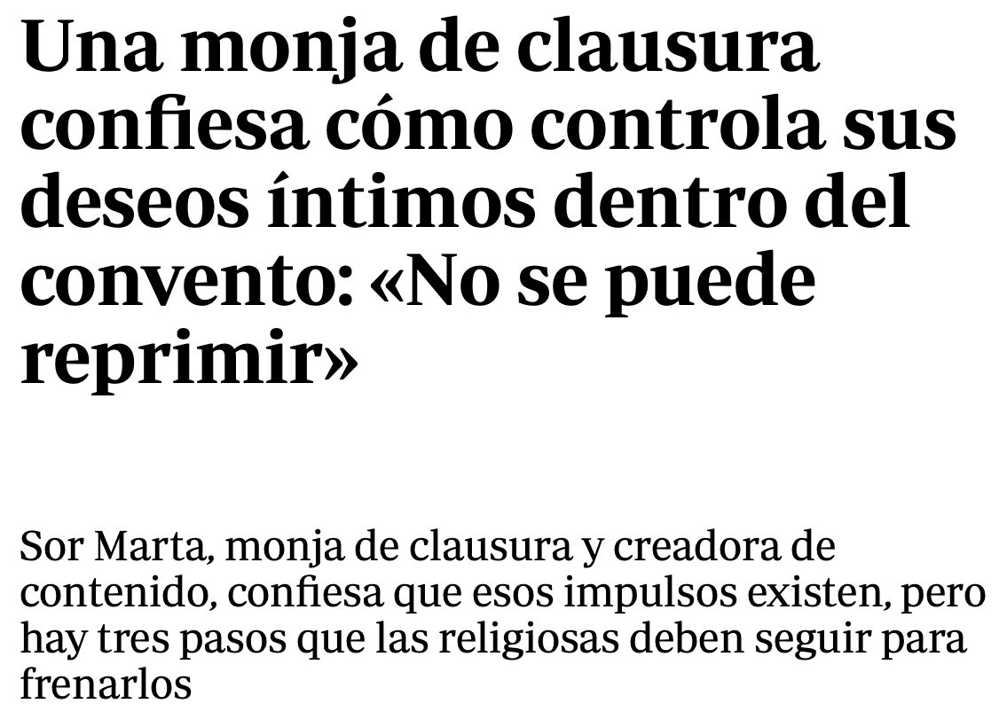 En segundo lugar, sor Marta declara que para controlar dichos deseos lo que hace es «apoyarse en Dios». «En nuestro caso, la sexualidad y el cuerpo se lo hemos entragado a él. Esto nos hace libres para amar sin enfocarnos en una sola persona», sostiene.